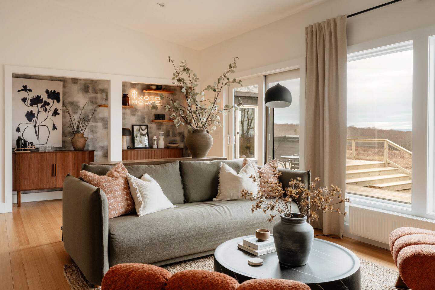 Koto House is set on 2 private acres overlooking a beautiful field and mountains in the distance. The home is peaceful and rural, but within an easy 5 minute drive to Livingston Manor. In town there are unique shops and restaurants, along with a wine bar and two breweries. Check out nearby world class fly fishing and beautiful scenic hikes. The Western Catskills boasts both a connection to nature and access to incredible dining, spas, and cultural activities.