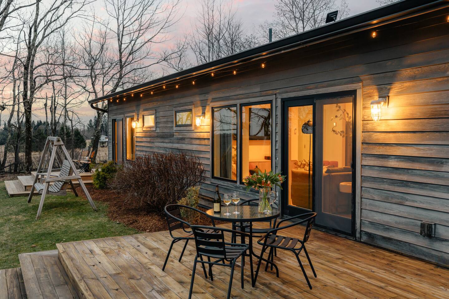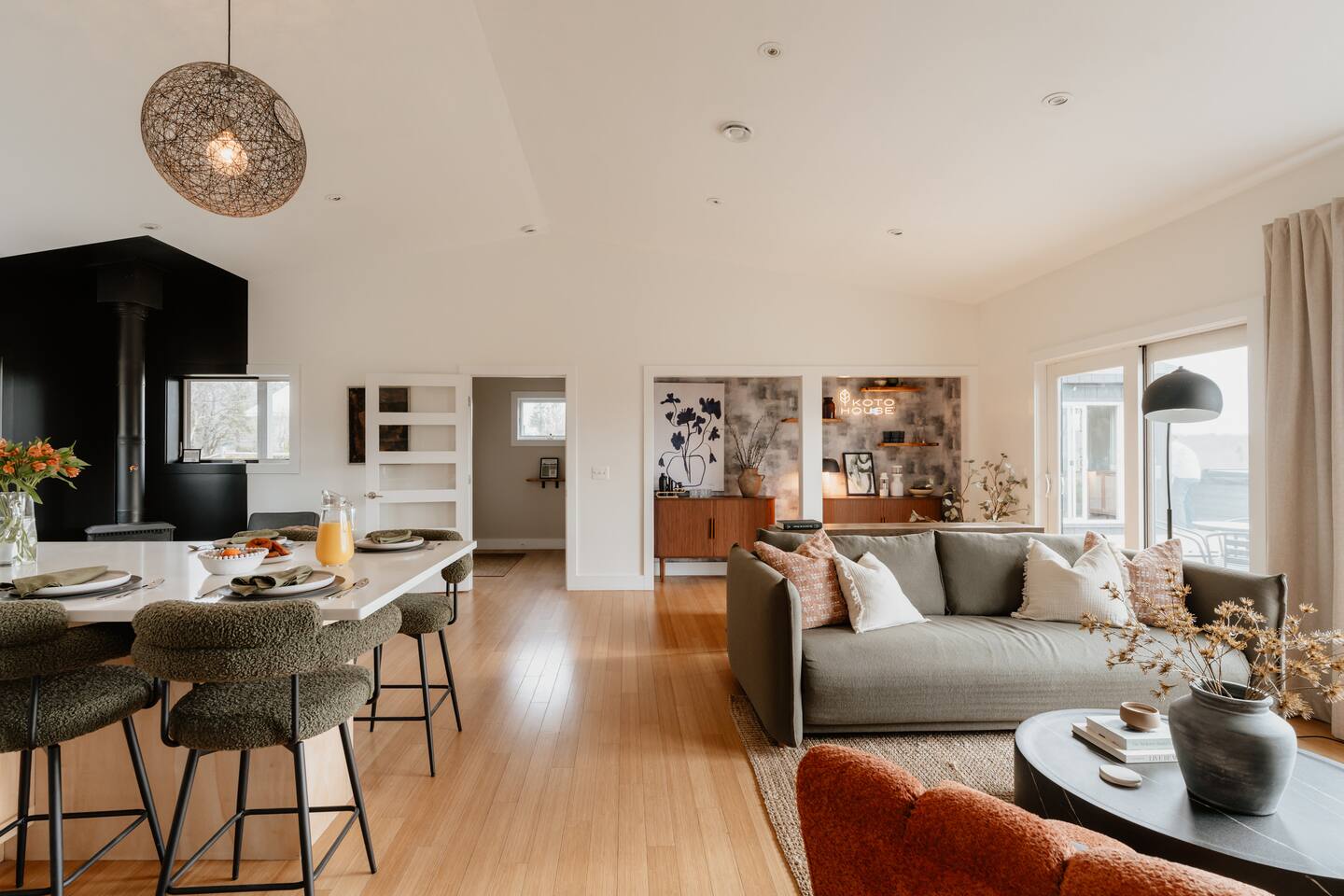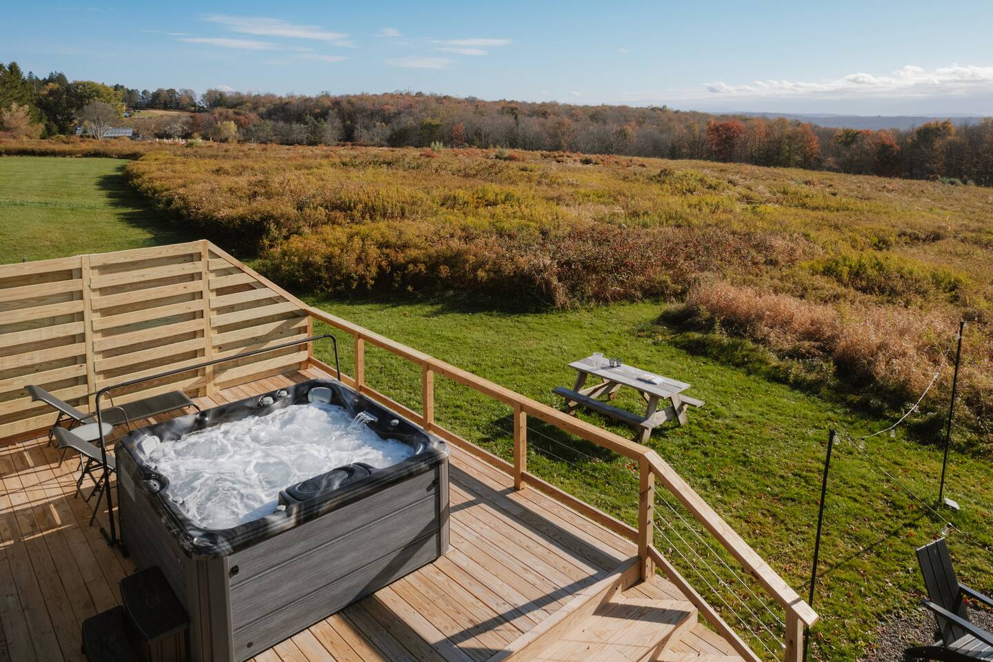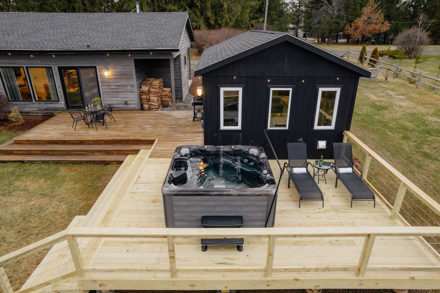 Koto is an old Finnish word that invokes a cozy and inviting place. Koto House was designed with Scandinavian influences as a restorative getaway that offers the following... KEY FEATURES: - Sleeps 6: 2 bedrooms and 1 queen-size sleeper sofa - 2 Bathrooms: 1 en suite with tiled shower and washer/dryer; 1 with shower/tub combo - Spa style hot tub - Custom built fire pit with string lights - Three expansive decks with multiple sitting areas - Complete home gym with cold plunge - Private home office with monitor - Modern and well-equipped kitchen (note: we provide Nespresso pods but not ground coffee or beans) - Indoor wood stove with sitting area - High speed WiFi and Roku tv's - Board games, puzzles, corn hole boards - Family friendly with pack and play and high chair - Dog-friendly - Gorgeous nature and mountain views - Walk to The Arnold house, and short drive to Livingston Manor, other nearby towns, and outdoor activities including hiking and fishing Read on for additional details below! ☆MAIN LIVING AREA☆ The main living area offers a large open space that opens via a sliding door to the backyard. A full wall of windows allows you to enjoy the peaceful nature view. - Living room with comfy seating - Smart Roku tv: log into your favorite streaming services - A Koala sofa transforms into an incredibly comfortable queen bed for sleeping extra guests - Bar area stocked with a blender for smoothies or post-workout protein, and all the barware needed for your favorite happy hour beverages - Sitting nook with a working wood stove. Firewood is provided by the host! ☆KITCHEN☆ - Eat in kitchen with a large island and quartz countertops - Full range of kitchen appliances, dinnerware and cookware - Drip coffee maker, French press (we do not provide coffee grounds) - Nespresso machine with pods provided ☆BEDROOMS & BATHROOMS☆ Primary suite - King bed - Private deck with seating overlooking the backyard - Dedicated office accessed from this bedroom, doubles as a perfect sleeping space for young children Second bedroom - Queen bed - Private deck with seating Additional sleeping space - Queen sleeper sofa in living room Bathrooms - En suite off primary bedroom with tiled shower - Second bathroom in hallway with tiled shower/tub combination - Washer and dryer available in primary bathroom. Host provides laundry detergent pods. - Host provides shampoo, conditioner, and body wash from Public Goods, a company focused on sustainability and natural ingredients. ☆OUTDOOR LIVING☆ The property is set on 2 private acres, with the backyard overlooking a beautiful field and mountains in the distance. - Luxurious spa style hot tub with 24/7 access and guest control over heat and jets - Custom built fire pit with 6 Adirondack chairs (firewood provided by host) - String lights to create the perfect evening vibe - Outdoor dining table - Sun loungers - Gas grill - Private decks with seating off both bedrooms - Corn hole available for guests - Please note that we are dog friendly, but our yard is not fenced in ☆GYM☆ Don't miss a beat with your fitness routine! In a second building just adjacent to the main house is a fully outfitted gym, complete with: - Smith machine with adjustable bench, olympic barbell, full set of weights, and cable system - Peloton bike with commercial subscription. Log into your own account, or use a free trial. The bike has delta clip ins as well as toe cages, so you can use cycle shoes or regular sneakers. - Dumbbell set up to 50 pounds - Yoga mats and blocks - Kettle bells - Jump rope - Roku smart tv - Bluetooth speaker ☆COLD PLUNGE☆ Continue your daily cold plunge practice, or see what all the hype is about for the first time! We have a tub from The Plunge, with state of the art chiller. Precise temperature control allows you to immerse yourself in water down to 37F, or ease into the practice of cold therapy at a higher temperature. ☆HOME OFFICE☆ A dedicated home office space is accessed through a door from the primary bedroom. - High speed wi-fi - Monitor with USB and USB-c adaptor to extend the screen from your laptop. - Bluetooth mouse and keyboard ☆FAMILY FRIENDLY☆ Blackout curtains in the office make this room a perfect sleeping space for a young child in a pack and play. We provide: - Pack and play with sheets and mattress protector. There is a padded mattress cover for children over age one. - Bath tub lounger - High chair - Dinnerware ☆STAY HOME OR VENTURE OUT☆ Koto House is set on 2 acres, with the backyard facing a beautiful private field, perfect for those seeking quiet rejuvenation. The home is only 6 minutes from charming Livingston manor, with shops, fine food and wine markets, and delicious restaurants. Or, simply walk through the field to The Arnold House for dinner and drinks. A scenic drive connects you to other nearby towns, beautiful hiking, fly fishing, and other local attractions. ☆LOCAL ATTRACTIONS☆ - Livingston Manor: Discover unique shops and restaurants. (5 min) - Nearby towns: Explore Roscoe (10 min), Callicoon (22 min), and other cute villages in the Western Catskills - Fly Fishing: Book a guided tour with Dette Flies (6 min), the oldest family run fly shop in the world. - Hiking: Expansive trails in Willowemoc (25 min), Balsam Lake Mountain, and Sundown Wild Forests. - The Arnold House: Dine in The Tavern, a historic setting with delicious local fare. (1 min) - The DeBruce: Award winning fine dining restaurant. (14 min) - Hemlock Neversink Spa - Get a day pass, which includes 60 minute massage, lunch at onsite restaurant, and all day access to pool, fitness center, and other amenities (28 min) - UpWard Brewing (4 min) & Catskill Brewery (7 min): Enjoy local craft beer at two breweries nearby.